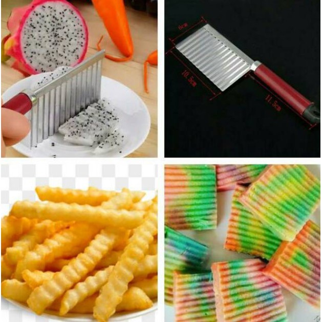 Pisau ini cocok untuk membuat potongan kentang, mentimun atau wortel untuk acar atau hiasan makanan. Bentuk pisaunya bergelombang sehingga hasil potongannya juga bergelombang rapi. Sajian makanan akan semakin terlihat sempurna bila dilengkapi dengan irisan hasil potongan pisau ini.Easy To CleanWave potatoes knife ini sangat mudah dipakai dan dibersihkan.Bahan: Stainless steel#pisau#pemotong#acar#peralatan#masak#stainless#gunting#bergelombang#perlengkapan#gelombang#bahan#dapur#pengiris#ken