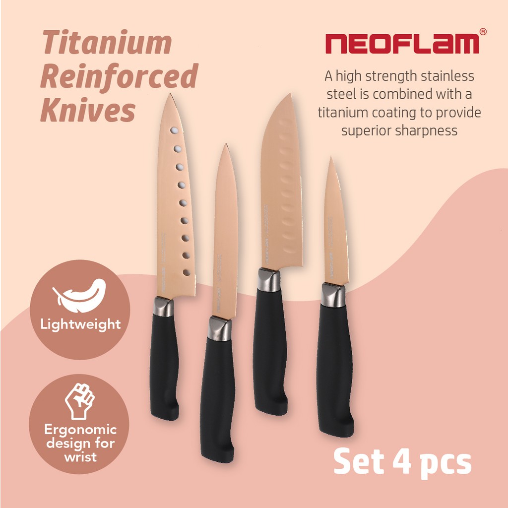 features :- titanium reinforced high-strenght stainless steel blade- fine edge blade that is durable and sharp- ergonomic handle designbenefits of titanium reinforced blade- better scratch resistance to normal steel- corrosion proof and odorless- non-toxic and non-allergenic- chemical and acid resistantuse & care- care should be taken as the knife has a sharp blade- keep out children's reach- use a cutting board surface when cutting ingredients- do not use the knife on food with bones- do not use the knife to cut frozen food- do not use harsh abrasive to clean the knife as it may leave fine scratches on the bladeSet ini terdiri dari :- 1 pcs Neoflam Titanium Utility Knife 5" Rose Gold- 1 pcs Neoflam Titanium Santoku Knife 5" Rose Gold- 1 pcs Neoflam Titanium Chef Knife 8" Rose Gold- 1 pcs Neoflam Titanium Pairing Knife 3.5" Rose