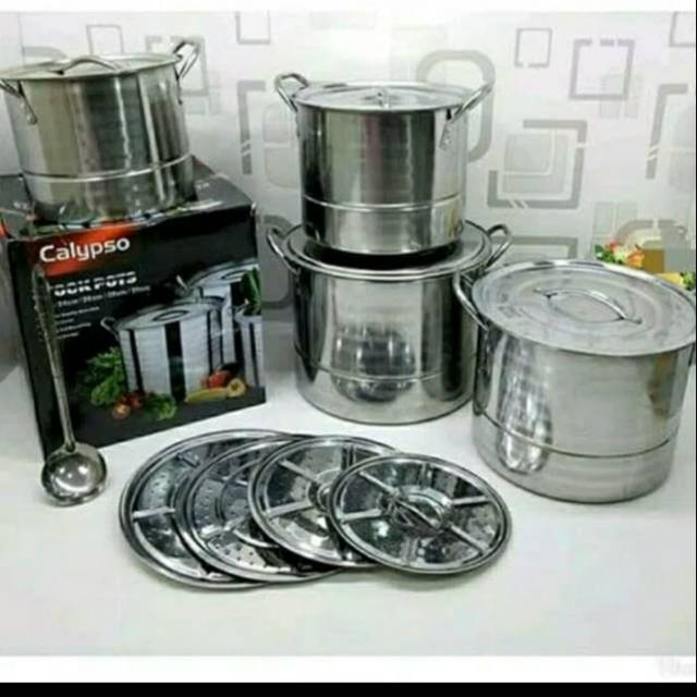 READY STOK"CALYPSO STOCK POT / PANCI STEAMER SETterbuat dari bahan Stainless kualitas tinggi, kuat serta handal dalam pemakaian, mudah dalam pemakaian dilengkapi dengan pegangan dikedua sisi serta desain yang elegant mudah untuk dibersihkan sangat cocok dalam melengkapi peralatan memasak andaBahan : Stainless Steel1 set terdiri dari :• Panci ukuran 24cm + saringan + penutup. • Panci ukuran 26cm + saringan + penutup. • Panci ukuran 28cm + saringan + penutup. • Panci ukuran 30cm + saringan + penutup.• Sendok / centong stain