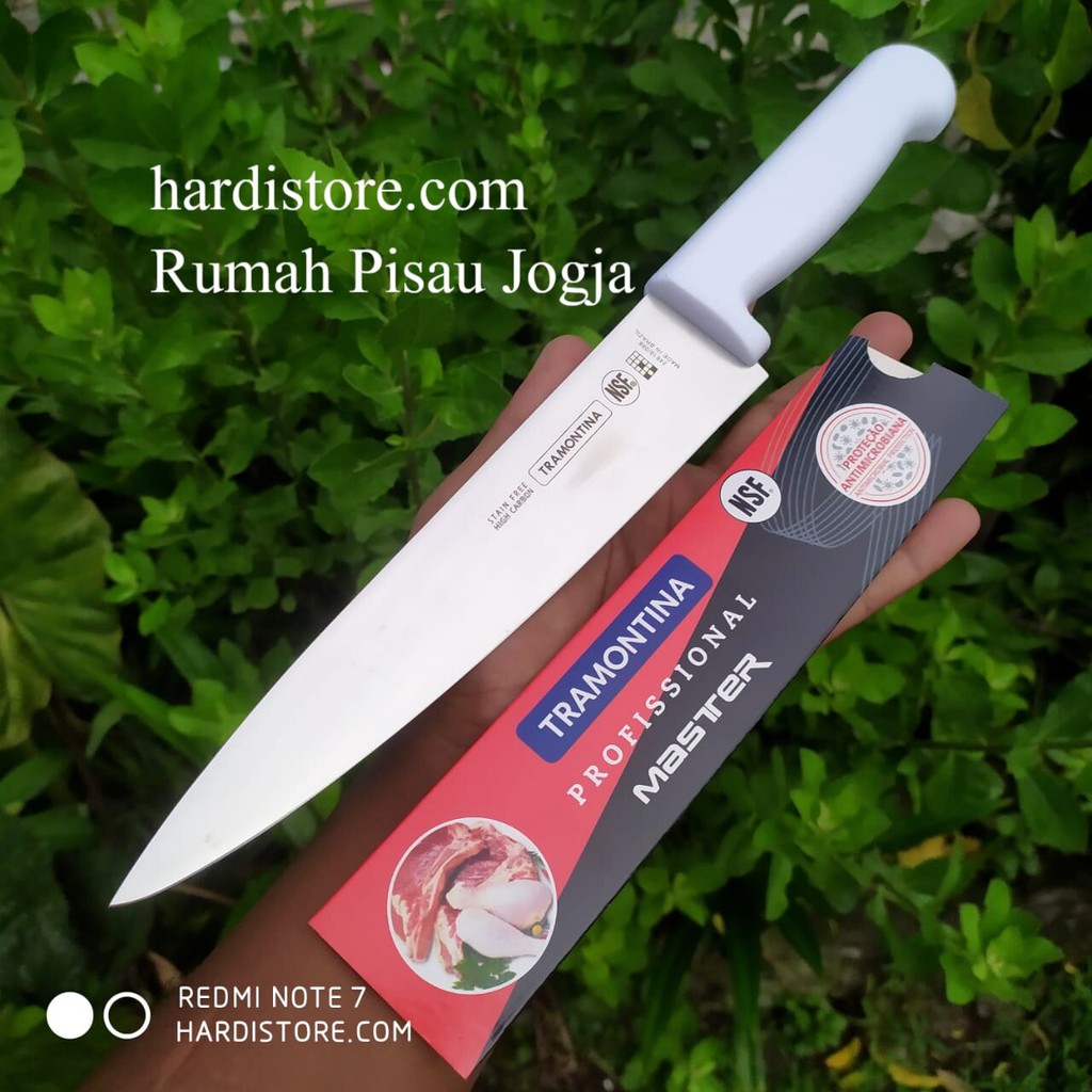 Pisau Tramontina Profissional Master adalah pisau yang berkualitas, 100% ASLI produk TRAMONTINA BRAZIL.Pisau yang banyak dipakai para Jagal Hewan, Panitia Qurban, Tukang Masak di Hotel, Restaurant, Rumah Makan serta untuk melengkapi kebutuhan dapur keluarga anda..Speck:=> Asal Negara: Brazil=> Kode Pabrik: 24619/088=> Blade: Special Krupp 1.4110 atau Sandvik 12C27 Stainless Steel dengan tingkat kekerasan 56 HRc=> Panjang Bilah: 8" atau 20 cm.=> Handle Polypropylene Bertekstur, warna PUTIH dengan Antimicrobial Protection (Perlindungan dari Bakteri)=> Fungsi Utama: Iris Daging, juga untuk mengiris bahan masakan lainnyaKeunggulan:1. Bilah terbuat dari bahan berkualitas yang sangat kuat, mudah diasah, tahan karat dan awet ketajamannya.2. Handle Polypropylene dengan Antimicrobial Protection sehingga nyaman di genggaman, tidak licin dan perlindungan dari bakteri3. Perawatan mudah, tinggal dicuci, keringkan dan simpan.4. Harganya bersaing, lebih murah dari pisau sejenis.5. Jaminan Kualitas dan Direkomendasikan dari Lembaga Keamanan dan Kesehatan Publik Amerika Serikat.Miliki segera dengan harga terjangkau dengan kualitas unggul.Dapatkan hanya di HardiStore Rumah Pisau Jo