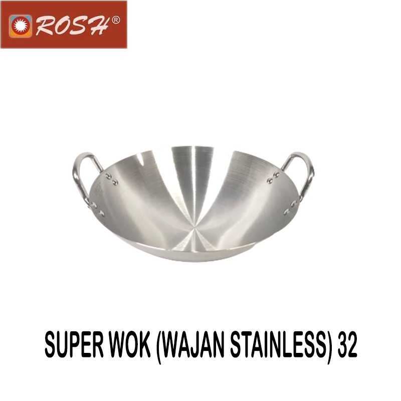 ROSH - Super WOK 32CMKuali Wajan Penggorengan dengan bahan dasar Stainless Steel non-magnetic, higienis, dan aman digunakan sehari. Bahan wajan tebal tidak mudah penyok, awet dan tahan lama. Cocok untuk penggunaan di rumah, restoran maupun cafe.- Bahan Stainless Steel- Cepat panas- Cocok untuk pemakaian rumah maupun restoran- Awet dan Tahan lama- Terdapat Cap Label Merk dan UkuranDimensi Produk :Diameter Wajan : 31cmTinggi Wajan = 8,8cmBerat = 1014gramVolume Kemasan = 35 x 14 x 32 = 261