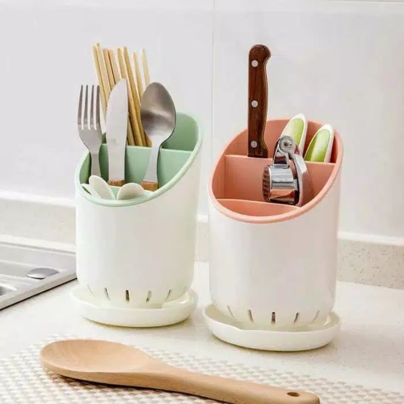 Tempat Sendok Garpu Dengan Tirisan Tempat Peralatan DapurUkuran : ~12.5 x 12.5 x 19 cmBahan : PlastikAsal : ImportFungsi : Cutlery drainer organizer holder sendok, garpu plus wadah tirisan air holder unik untuk tempat peralatan makan seperti sendok, sumpit dan garpu. Uniknya, bagian bawah holder terdapat lobang tirisan air dan ada wadah untuk menampung tirisan air dari peralatan makan yang baru selesai dicuci.Note : 1. Wajib memesan bubble untuk barang rentan