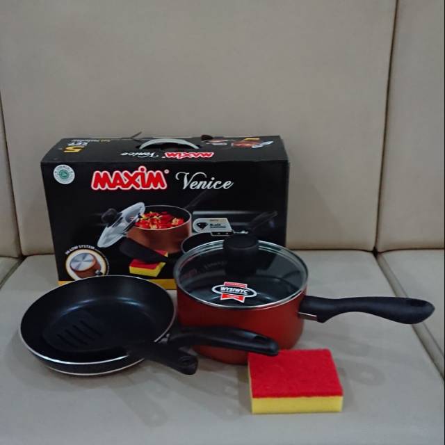 Panci Set Maxim Venice 5 pieceDaftar isi:Panci Saucepan 17 cm dan tutup kacaPenggorengan 20 cmSpatula nilonSpongeMenggunakan lapisan anti lengket Black Diam