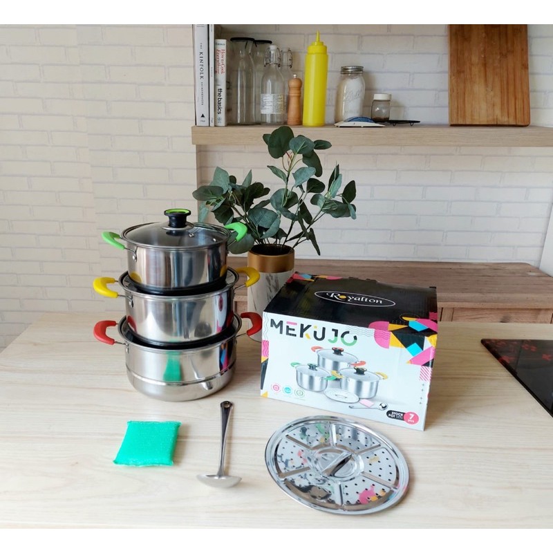 Panci set masak Mekujo PotsUkuran 22cm + Steamer ( Merah )Ukuran 20cm ( Kuning )Ukuran 18cm ( Hijau )Free 1 spon cuci dan 1 sendok say
