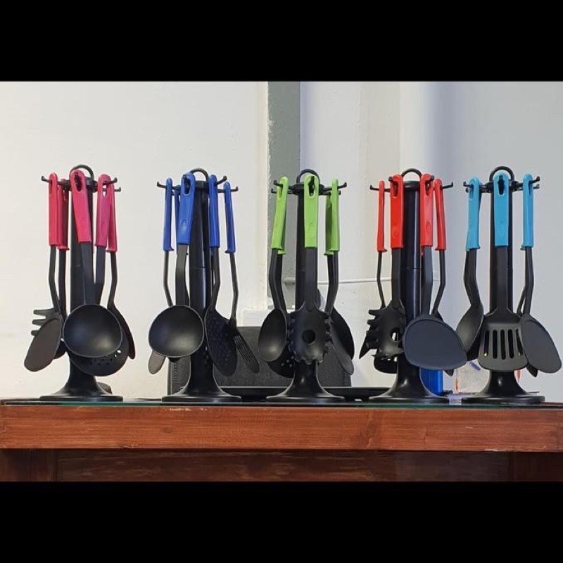 deskripsi produk :Spatula set warna ini terbuat dari bahan yang bebas BPA NILON, yang tidak mengandung racun dan aman untuk memasak. Bahan NILON juga dapat mudah di bersihkan dan jangan noda atau mengumpulkan bau tidak seperti plastik lama.Di rancing khusus pegangan non slip memberikan pegangan yang nyaman bahkan ketika basah. Panjang menangani dan besar kepala tidak akan memberikan anda mendapatkan kotor saat mengorek-ngorek masakan sangat mau matang.Isi Paket :- 1pcs soup ladle- 1pcs slotted spoon- 1pcs pasta spoon- 1pcs solid spoon- 1pcs slotted turner- 1pcs str