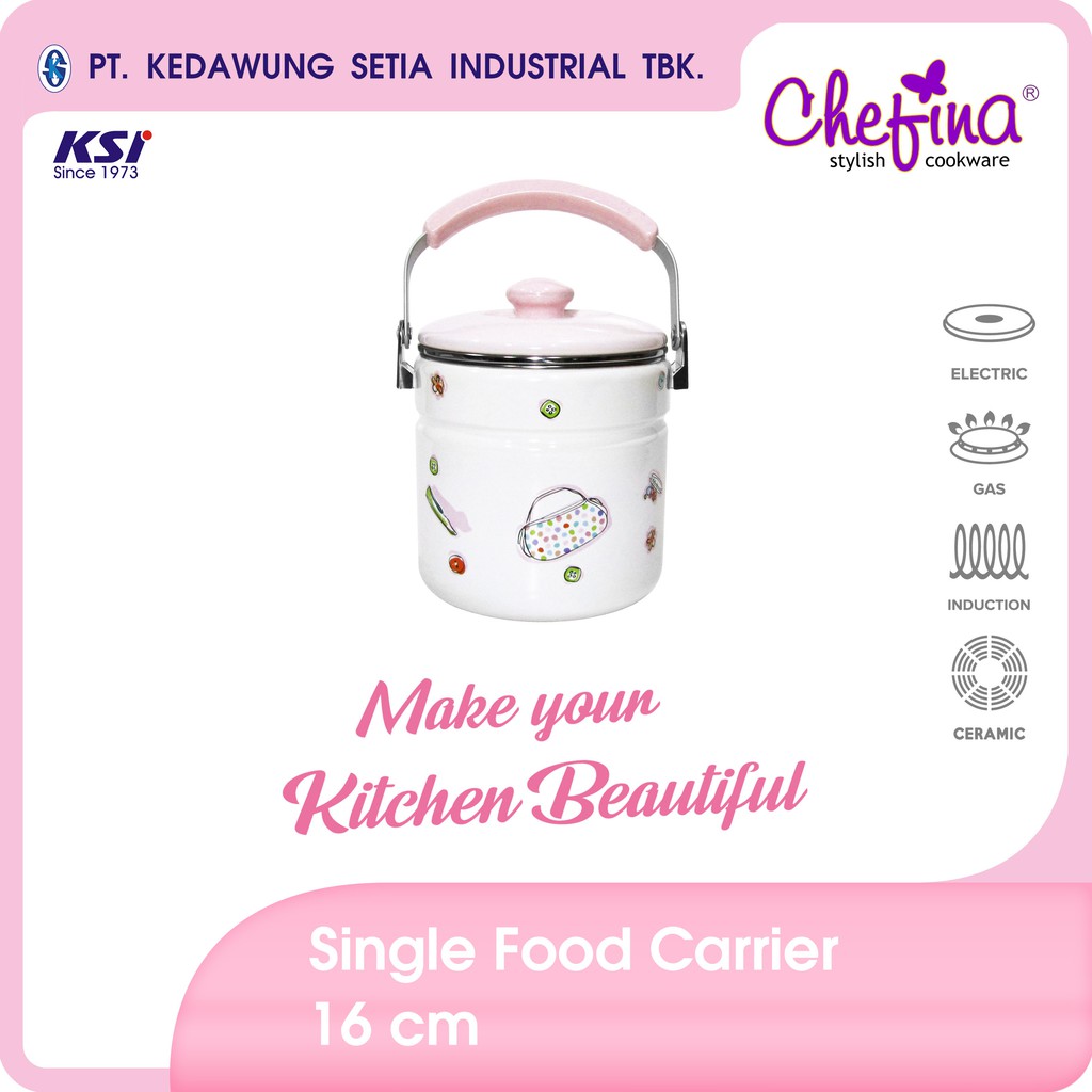 Chefina “Beauty in the Kitchen” adalah salah satu produk by KSI berbahan enamel yang memiliki warna dan desain trendy menjadikan dapur Anda lebih berwarna. Menggunakan material terbaik standar internasional yang menjamin kualitas masakan lebih sehat karena tidak ber-reaksi dengan masakan yang mengandung asam, tidak merubah kandungan dan cita rasa makanan (Food Grade).Spesifikasi:Handle: Pink melamineKnob: Pink melamineCover: Steel lidDiameter: 16 cmHeight: 14.5 cmWeight: 825 grVolume: 1.8 literColourInside: New whiteOutside: New whiteLid: Vania pinkFitur:- Rantang tunggal yang dirancang agar dapat digunakan sebagai alat hantar, penyimpanan dan juga bisa untuk memanaskan tanpa harus memindahkan makanan ke tempat lain.- Lepek sebagai wadah untuk peletakan makanan pelengkap Anda.- Didukung dengan desain stylish untuk meningkatkan suasana hati ketika menghantarkan makanan bagi keluarga tercinta.- European standard design yang membuat dapur Anda lebih berwarna.- Food Grade, menjadikan masakan lebih sehat dan aman pada saat digunakan.- Tahan terhadap pemanasan sampai dengan 450°C.- Warna yang cerah dan long lasting karena melalui proses pembakaran di suhu 850°C.- Tidak gampang tergores, aman untuk oven, mudah dibersihkan dan higienis menjadi keunggulan enamel by KSI.- Bisa digunakan pada semua kompor seperti gas, induction dan electric.- ECO friendly material berstandar internasional (SNI, LFGB 23, FDA Cal Prop 65,