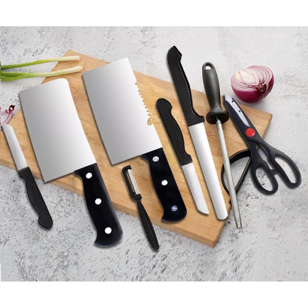 Sering kehabisan waktu memasak karena terlalu lama memotong-motong bahan?Sekarang ada Pisau Set 8 pcs untuk membantu kamu!Satu set pisau dapur yang tajam dan dilengkapi dengan asahan mempermudah dan menyingkat waktu untuk memasak sehingga memasak semakin menyenangkan terutama untuk kamu yang hobi masak namun tidak punya waktu :)Isi dalam kemasan:1 pisau golok untuk daging (meat cleaver)1 vegetable cleaver1 chef’s knife1 utility knife1 paring knife (pisau buah)1 peeler (alat pengupas kulit buah)1 gunting1 pengasah