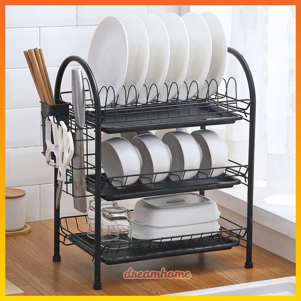 NOTE PRODUK : Kapasitas 3 susun : Tingkat pertama dapat menampung 16 mangkuk, tingkat kedua dapat menampung 16 mangkuk, tingkat ketiga dapat menampung 13 piring, 3 pisau dapur, 20 pasang sumpit, talenan, 4 kait untuk menggantung peralatan dapur lainnya. Cocok digunakan di dapur, restoran, dan kantin untuk tempat menyimpan mangkuk, piring, pisau dan sendok garpu, talenan, dan cangkir/gelas. Terbuat dari bahan baja karbon dengan teknik pengecatan nano anti karat, cat tidak mudah mengelupas, awet hingga bertahun-tahun Kokoh mampu menampung beban hingga 10 kg (2 susun) dan 15 kg (3 susun) Dilengkapi dengan pengait, wadah talenan, matras anti selip di bagian kaki, dan water tray (alas air) agar air hasil pengeringan tidak membasahi dapur Desain minimalis dan elegan, dapat dibongkar pasang sangat cocok untuk anda yang senang berpergian/akan pindah rumah Sangat cocok dijadikan hadiah untuk ibu atau keluarga yang baru menikah :)Detail produk :Bahan : PP + Besi karbonPengecatan : Nano powder spraying coatingTingkatan : 2 susun / 3 susunWrana : HitamUkuran rangka utama:42 x 23 x 35cm (2 susun), 42 x 23 x 47cm (3 susun)Ukuran kemasan (+kardus packing):56 x 23 x 35cm (2 susun) , 56 x 23 x 47cm (3 susun)Kapasitas maksimum per rak : 5 kgBerat bersih 1.54 kg (2 susun), 2.28 kg (3 susun)Isi dalam paket :- 2 pcs Rangka utama pegangan kiri dan kanan- 2 pcs Rangka untuk meniriskan piring (3 pcs untuk 3 level)- 1 pcs Pengait/Gantungan- 1 pcs Penyimpan nampan- 1 pcs Tempat Penyimpanan Sendok/Sumpit- 2 pcs Alas/wadah air (3 pcs untuk 3 level)- 1 buah petunjuk pengg
