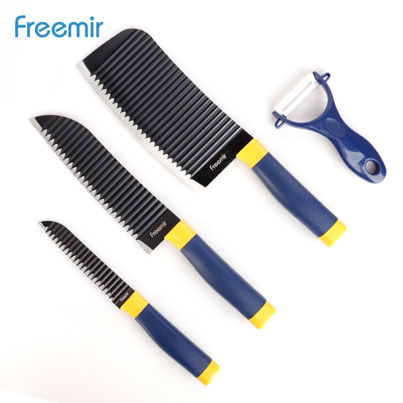 Keunggulan:1. Body stainless steel, sangat tajam2. Lapisan anti lengket, makanan mudah dipotong3. Pegangan anti slip, aman digunakan4. Desain bergelombang, tidak mudah menempel pada makanan5. Potong daging dan sayuran lebih mudah, cocok untuk berbagai bahan6. Bisa sebagai Chopper/cutter/gunting, kombinasi sempurna7. Cocok untuk hadiah, layak dan canggih8. Teknologi antibakteri, aman dan sehatBahan: badan pisau Stainless steel30CR13 + cat timbulWarna: hitam + biruUkuran produk: Pisau pemotong 31*17.5*8 cm, 255g;Pemotong daging 31*18,5*4.5cm, 134g, pisau buah 23*12*2.3cm, 55g; alat pengupas sayur dan buah 13*8*0.5cm, 12gDaftar kemasan: pisau potong * 1 buah pisau pemotong, pisau pemotong daging * 1 buah, pisau buah * 1 buah, alat pengupas sayur dan buah * 1 buah, 12gBerat: berat bersih 505g, berat kotor 601gUkuran kemasan: 34*22*3.5 cmMetode pengepakan: kotak kertas kraft kelas