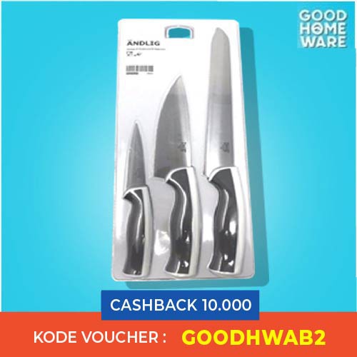 Pisau set isi 3 * BEST SELLER *Terdiri dari: pisau roti 23 cm (tot. panjang 35 cm), pisau koki 15 cm (tot. panjang 28 cm) dan pisau iris 10 cm (tot. panjang 20 cm).fitur utama- Desain dan bahan gagang memberi pegangan yang kuat.cara perawatanHanya dapat dicuci dengan tangan.Dekripsi produk & ukuranGagang: Plastik polipropilena, Karet sintetisMata pisau: Baja tahan