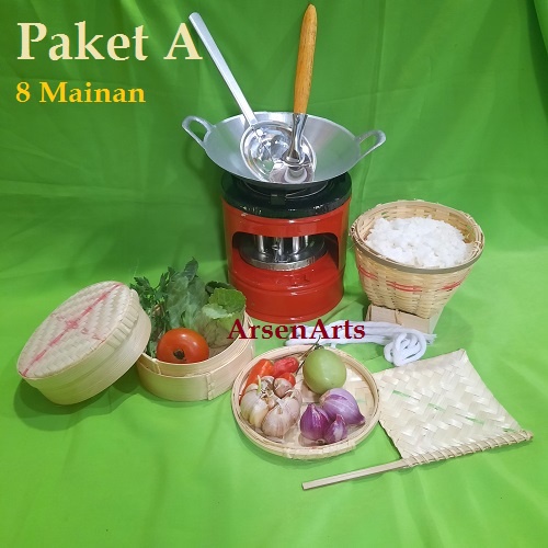 Mianan Masak-masakan Anak Perempuan Mainan Alat Dapur / Alat Masak Tradisional Paket Sederhana.Paket ini yang sederhana untuk mainan masak=masakan anak perempuan ada 8 macam mainan diantaranya :- Kompor : kompor ini bisa digunakan selayaknya kompor beneran dengan bahan bakar minyak tanah.- Wajan Set (Wajan, Spatula, Saringan)- Bobokoan, Tampah, Tenong/Kerucut, Kipas.Spesifikasi :Komporan Tinggi 12 cm diameter 12 cm bahan seng / plat 0,3 cmWajan diameter 12 cm bahan aluminiumSpatula panjang 18 cm lebar 4 cm bahan Seng dan kayuSaringan panjang 18 cm diameter 7 cm bahan SengBobokoan tinggi 8 cm diameter 8 cm, tampah diameter 8 cm, kipas 6 x 7 cm, tenong / kerucut diameter 8-9 cm semuanya bahan dari anyaman bambu.Tidak ada ga