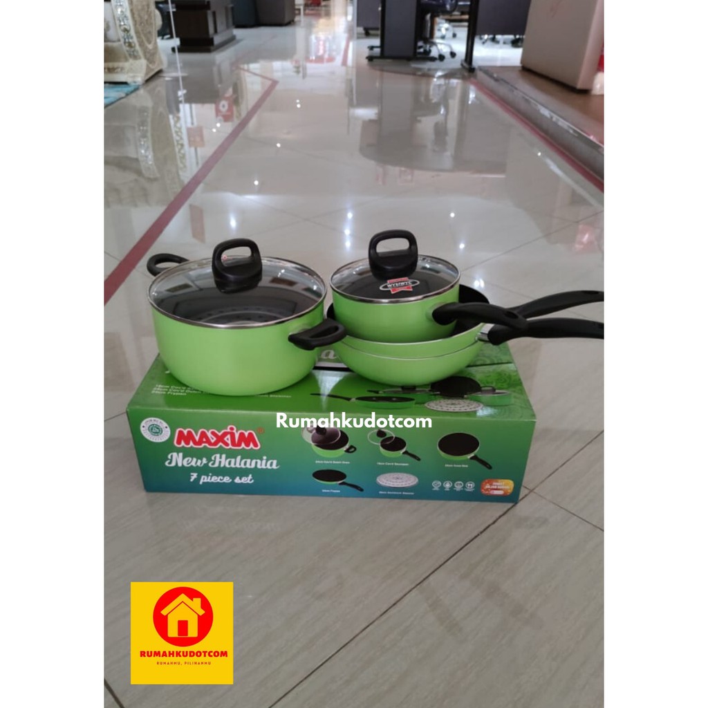 Maxim New Halania 7 Pieces Set7 in 1 Set, Ekonomis dari MAXIM dengan produk berkualitas semuanya non stick coating, bebas dari PFOA dan Sudah sertifikasi HALAL dari MUI !!!. Warna Hijau modern yang sangat indah menambah keinginan untuk masak ! Handle dengan bahan bakelite, anti slip tidak mudah terpeleset dan terhindar dari kecelakaan saat memasak. Aluminium base membuat panas dapat menyebar dengan merata !BACA DULU !MAXIM New Halania 7 Piece Set yang ekslusif berisi :1. 18cm Saucepan Maxim New Halania2. 24cm Dutch Oven Maxim New Halania3. 24cm Fry pan Maxim New Halania4. 24cm Yuva Wok Maxim New Halania5. 22cm Aluminium Steamer6. 18cm Tutup Kaca SAJA7. 24cm Tutup Kaca SAJAYuk buruan diorde