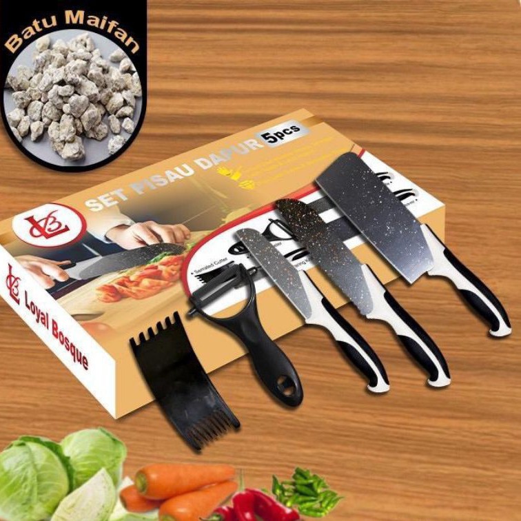 Knife Set 5 Pcs + 1 Ceramic Peeler ( J13 ) Spesifikasi: J13 > 5pcs Knife Set ( Pisau Koki, 8" Pisau Roti, 8" Pisau Slice, 5" Pisau Utilitas, 3.5" Pisau Pengupas ) + 1 Pengupas Lapis Keramik. > Gagang dengan campuran batu maifan > Lapisan lapisan granit > Non Stick Coating Blade. > Dibuat untuk Koki Profesional. > Kemasan Kotak Cantik. > UKURAN PRODUK 32x17x4 > UKURAN PAKET 36 X 21 X 8 BERAT 300 GRAM Keunggulan produk: - Dengan mata pisau berbahan dasar Stainless steel yang tajam - Lapisan anti lengket - Pegangan pisau yang tidak licin / anti slip dan ergonomis - Fitur pelindung jari untuk keamanan dan kenyamanan dalam mengenggam - Mata pisau anti bakteri - Lekukan - lekukan di mata pisau, untuk membantu melepaskan bahan makanan yang tipis setelah dipotong Catatan saat menggunakan: - Jangan meninggalkan produk di dekat api - Jangan membersihkan mesin cuci piring - Jangan mengambil risiko menggunakan tangan Anda untuk menguji ketahanan pisau Anda untuk menghindari cedera - Jauhkan produk dari jangkauan anak-anak - Bersihkan dan keringkan produk setelah digunakan untuk menghindari karat - Hanya gunakan tujuan