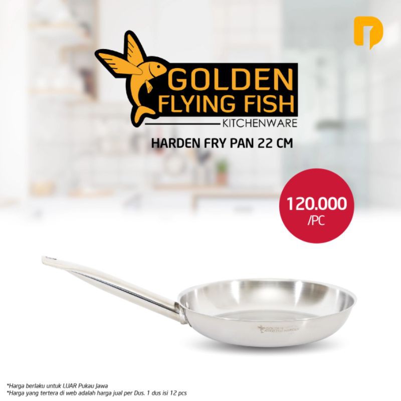 Inovasi tiada henti dari Golden Flying Fish, Frypan Harden Anti Lengket!Pengalaman menggoreng & menumis menjadi lebih cepat karena tidak lengket, hemat minyak, cepat panas & panas merata. Bisa dipakai di kompor listrik, induksi & kompor biasa.Diproduksi dengan menggunakan bahan baku stainless steel 430, bersertifikat SNI (Standar Nasional Indonesia) dan food grade sehingga aman digunakan untuk memasak masakan kesukaan anda dan keluarga seperti ayam goreng, ikan goreng, sosis goreng, ham goreng, tumis kangkung, tumis bayam, tumis buncis, dan makanan lainnya.Bahan baku stainless steel dengan ketebalan 1,2 mm menjadikannya lebih kuat dan tahan lama. Tersedia dalam beberapa pilihan ukuran untuk menyesuaikan kebutuhan anda.Golden Flying Fish, peralatan masak berbahan baku stainless steel berkualitas, tidak berbahan kimia, lebih tebal dan kuat, serta tidak mengubah rasa pada makanan anda.Kelebihan Frypan Harden Golden Flying Fish1. Tidak lengket (tetap harus menggunakan minyak / media lainnya).2. Panas merata & cepat panas sehingga hemat energi.3. Bentuk ergonomis, fungsional & praktis.4. Gagang tidak panas waktu memasak.5. Bisa dipakai di kompor listrik, induksi & kompor biasa.6. Mudah dibersihkan.7. Antikarat.8. Bahan stainless ber SNI & Food Grade.Tersedia dalam 3 ukuran: 20 cm, 22 cm dan 24