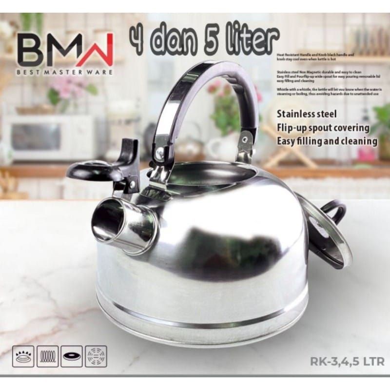 Spesifikasi Produk :- Material Stainless steel ware- Dimensi Produk : 19 x 19 x 18 cm- Dimensi Box :19 x 13,5 x 19 cm (kubikasi)- Dimensi Volume Kettle 4.0 L dan 5.0 L- Pegangan kettle terdapat anti panas- Terdapat Alat Untuk Deteksi air saat mendidih dan mengeluarkan BunyiDengan ketel siul ini memudahkan kita saat melakukan memasak air untuk membuat kopi, teh, susu, dll dengan indikator bunyi menjadikan ketel/teko ini diminati banyak orangBerbahan stainless steel ware menjadikan teko ini tampil tampak mewah bahan stainless menkilat anti karat dan mudah penyimpanan teko ini bisa digunakan usaha Ukm seperti warung, kedai, penjual minuman lainnya atau dipakai dirumah, dibawa saat camping, dll serta mudah dibawa kemana