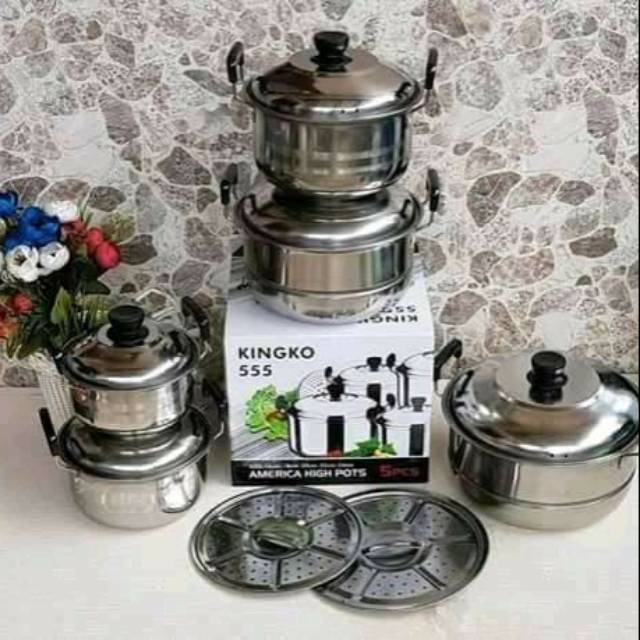 Kingko 5 Pcs America High Pots/ Panci steamer- 1 set terdiri dari 5 pcs ukuran sbb :Diameter 24 cm tinggi 11.5 cm,Diameter 22 cm tinggi 10.5 cm,Diameter 20 tinggi 9.5 ,Diameter 18 tinggi 8.5,dandiameter 16 tinggi 7.5- desain modern- handle tahan panas- bahan stainless- mudah di bersihkansilahkan tambahkan bable untuk pengiriman..no komplain no retur barang sblm d kirim sudah dlm kondisi baik jika ada kerusakan akibat kurir atau ekspedisi bukan tanggung jawab kami.trmkshmembeli= setujuno komplain=no returkerusakan akibat ekspedisi bukan tanggungjawab kamijika stok panci steamer kosong akan kami kirim panci 5susun tutup kaca tanpa konfirmasi#panci #kingko #kingko555#pancitutupkaca#pancilimasusun#pancisten