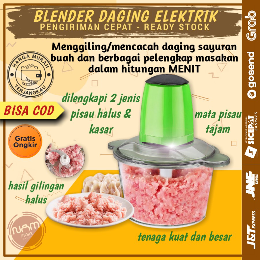BELENDER BLENDER DAGING PORTABLE PORTABEL MINI PENGGILING GILINGAN DAGING ELEKTRIK ALAT MASAK DAPURBlender Daging Elektrik Pisau Ganda - Electric Meat Grinder Meat Grinder Food Processor Penggiling Daging Serba guna merupakan penggiling daging terbuat dari bahan food grade plastic yang menggunakan mata pisau yang tajam memudahkan kita mengelolah makanan/daging lebih halush ⚠️ MOHON BACA DESKRIPSI SAMPAI HABIS KENAPA SIH BELI PRODUK INI?✅ Chopper Pisau Blender Ganda (Dapat 2 Macam) hanya Produk kami yg mendapatkan 2 jenis pisau blender✅ Mesin Penggiling ini menggunakan mata pisau yang tajam memudahkan kita mengelolah makanan/daging lebih halus✅ Dengan tenaga yang kuat danbesar kekuatan ganda✅ Menggiling/mencacah daging sayuran buah dan berbagai pelengkap masakan dalam hitungan menit✅ Dilengkapi dengan 2 jenis pisau untuk hasil blender halus dan kasar SpesifikasiProduk:✅ Nama Produk : Electric Meat Grinder Penggiling Daging✅ Voltage : 220V ~ 50HZ✅ Watt : 250 W Cara Pengoperasian :✅ Pastikan pisau blender terpasang benar di wadah mangkuk✅ Pastikan mesin blender sudah terpasang pas sesuai dengan garis pada wadah✅ Colok kabel ke arus listrik✅ Tekan dan tahan tombol Power selama 10 detik lalu lepas selama 1-2 detik dan tekan lagi tombol Power (Ulangi sampai hasil blender yg diinginkan)PRODUK YANG KAMI JUAL BERKWALITAS DAN ORIGINAL TERIMA