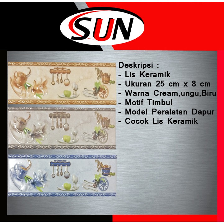 PERHATIAN !!1. Harap Mencatumkan Warna Yang Di inginkan Atau Kami Kirim Sesuai Stock yang tersedia2. Free Bubble Wrap3. Sudah Termasuk Packing KayuDeskripsi :- Lis Keramik- Ukuran 25 cm x 8 cm- Model Timbul- Motif Peralatan Dapur- Warna* Cream* Ungu- * Biru- Cocok Pingiran keramik----------------------------------------------------------------------------------------------------------------------Salam,Sun Har